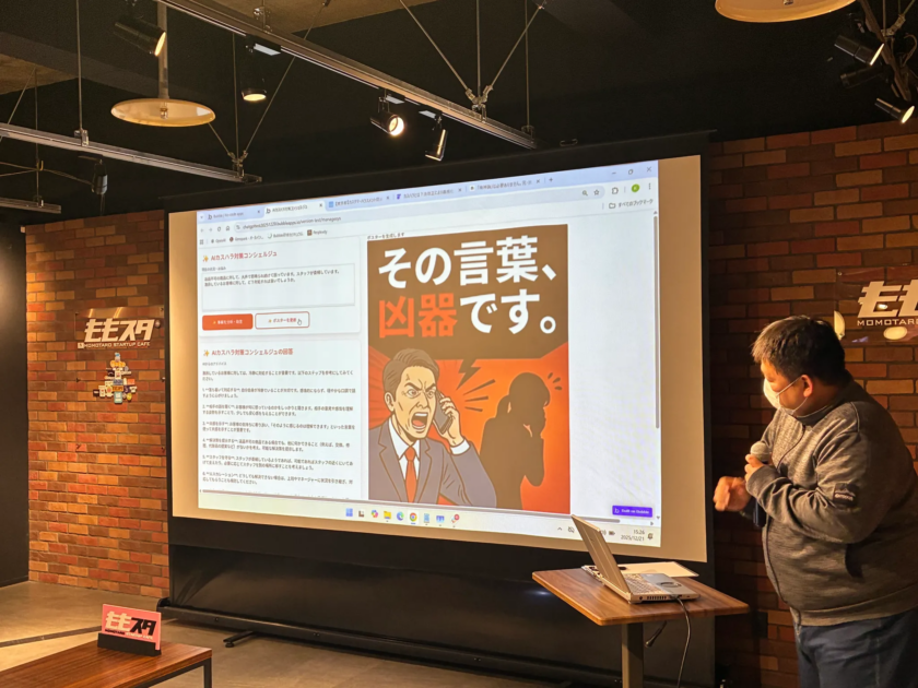 現場スタッフをカスタマーハラスメントから守るための支援ツールです。自身の10年の接客経験を基に、AIを活用した即時の対処アドバイス機能や、再発防止のための啓発ポスター自動生成機能を実装。孤立しがちな現場スタッフや店長が、法的な根拠を持って毅然と対応できる環境を作ります。