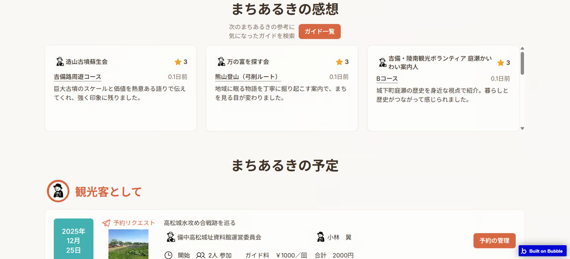 観光客と地元の観光ガイドを直接つなぐマッチングサイトです。「いつもの旅行の半歩先」をコンセプトに、ガイドブックにない地域の物語を体験できるコースを提供。これまで電話やFAXが主流だった予約フローをデジタル化し、個人ガイドが直接旅行者と繋がれる場を提供することで、地域の観光裾野を広げます。