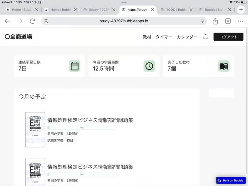 2月から開始される検定塾「全商道場」の生徒向けに開発された、内製学習管理アプリです。電子教材を閲覧できる「教材ビューアー」、学習時間を可視化する「タイマー機能」、そして日程管理の「カレンダー」を統合。塾の指導とアプリが連動し、生徒の合格を強力にバックアップします。