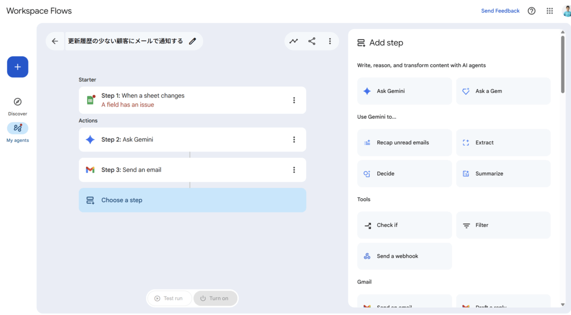 この「アルファ版」という点を理解した上で、Flowsの最も強力な活用事例を見てみましょう。Googleのデモでも多用される「顧客対応の自動化」です 。たった一つの「問い合わせ」を起点に、AIが判断業務まで含めて連鎖的に処理を実行します。