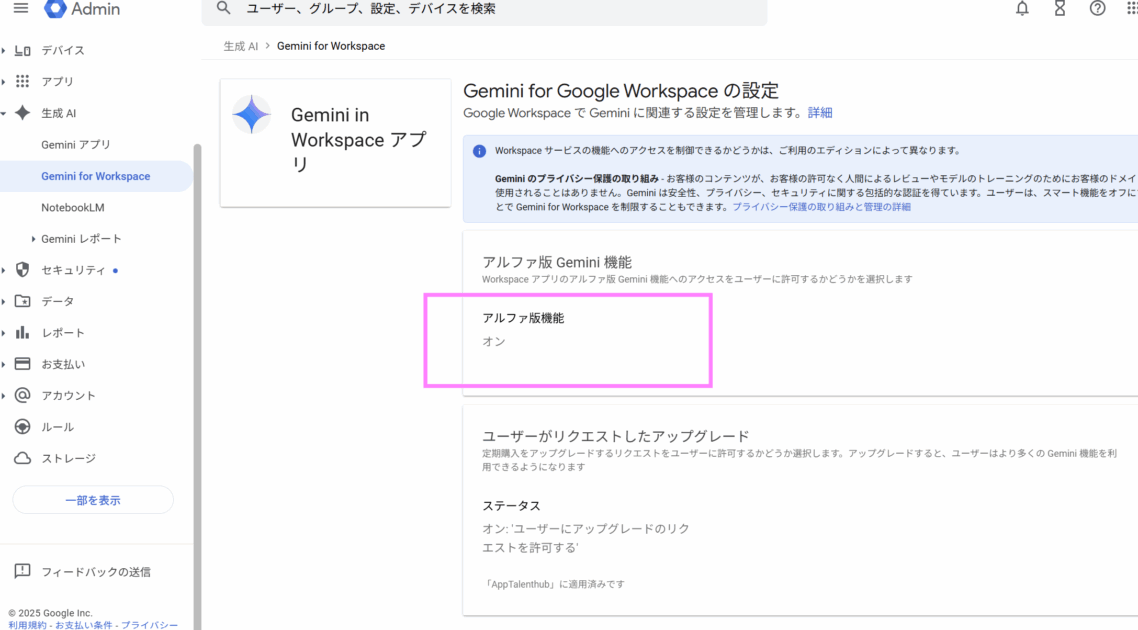 1. 利用するには管理者の「ON」設定が必要 アルファ版のため、この機能はデフォルトで「オフ」になっています。利用を開始するには、お使いのGoogle Workspaceの管理者が、管理コンソールにログインし、「Gemini for Workspace の設定」ページで、「アルファ版機能」のトグルを明示的に「オン」に切り替える必要があります 。この設定がOFFのままでは、Flowsを利用することはできません。