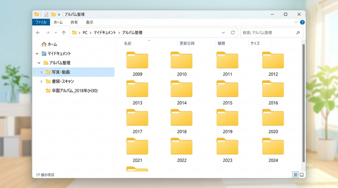 家族写真のバックアップフォルダを整理したいです。