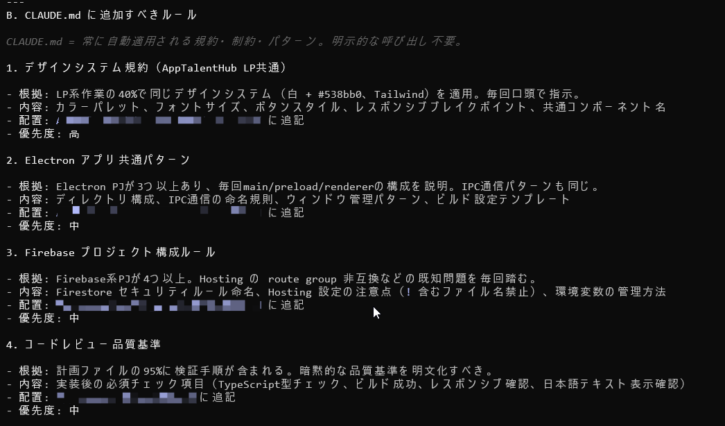 セッション履歴には、自分でも気づいていない反復パターンが含まれています。今回の分析では「LP制作の40%で同じデザインシステムを口頭指示している」「計画ファイルの95%に同じ検証手順が含まれている」といった暗黙知が発見され、CLAUDE.mdのルールとして明文化されました。