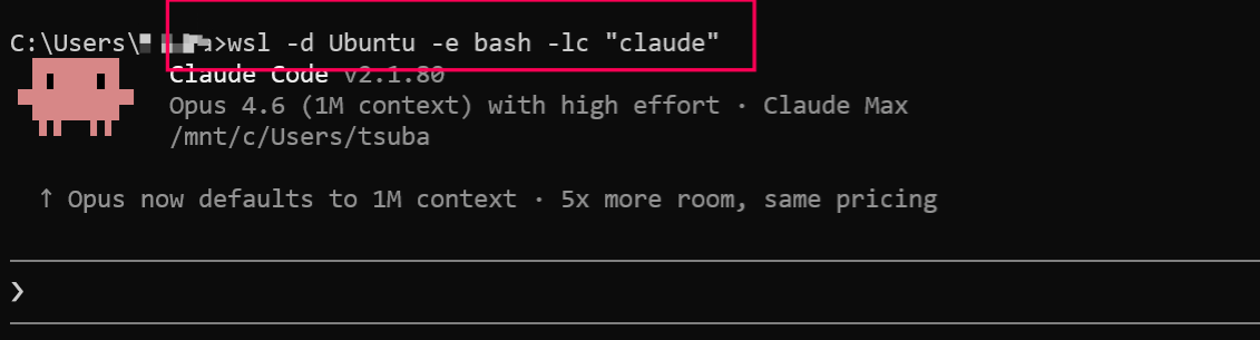 今までWindows上で claude と打つだけで起動していたのが、WSL経由では以下のコマンドになります。