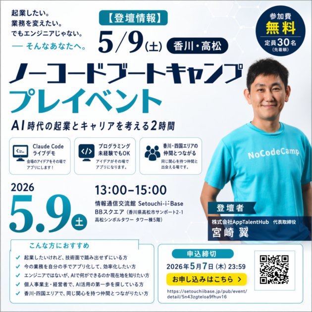 - 香川県「AI×ノーコード ブートキャンプ 2026」の企画・運営・講師を担当